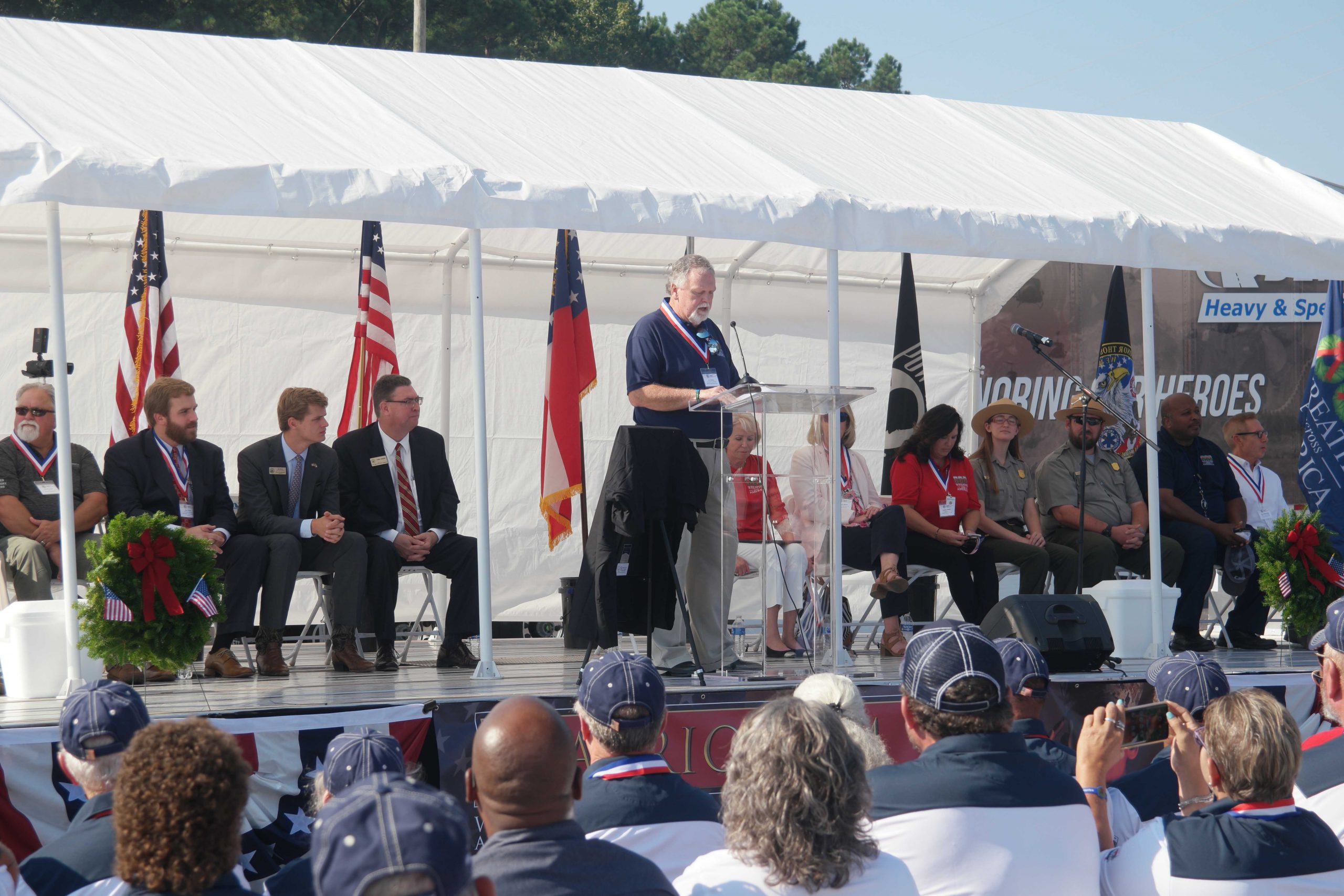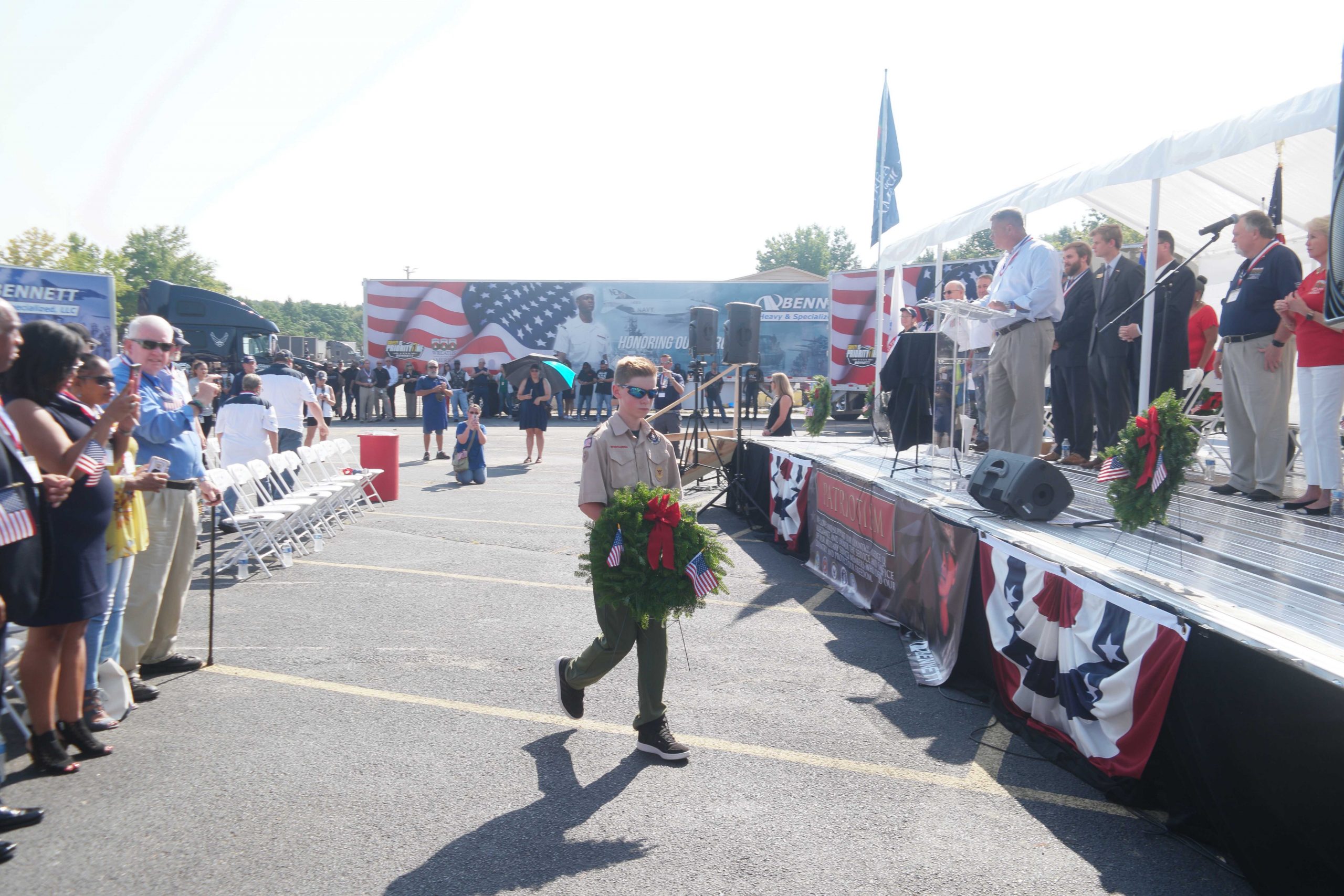 Bennett president and CEO, Marcia Taylor, Andersonville National Cemetery Administrator Charles Barr, Lee Gentry and keynote speaker, Debbie Sparks, Director of Transportation and Community Outreach at Wreaths Across America all addressed the crowd at the event. In addition, remarks were made by state and local officials as they joined in to support Bennett’s mission of supporting Wreaths Across America. Jim Utley, VP of Government Services at Bennett and a Retired Colonel in the US Army led a special recognition during the ceremony. Each branch of the armed forces was honored as the team drivers that participated in the convoy placed a wreath next to the designated armed forces flag to represent the fallen veterans at Andersonville National Cemetery. Bennett’s goal this year is to raise enough money to cover 15,000 of the 20,200 graves at Andersonville National Cemetery. The Wreaths Across America Traveling Education Exhibit was set up at Bennett’s home office during the event and on Driver Appreciation Day for the general public and guests to view.