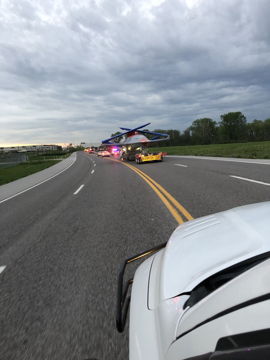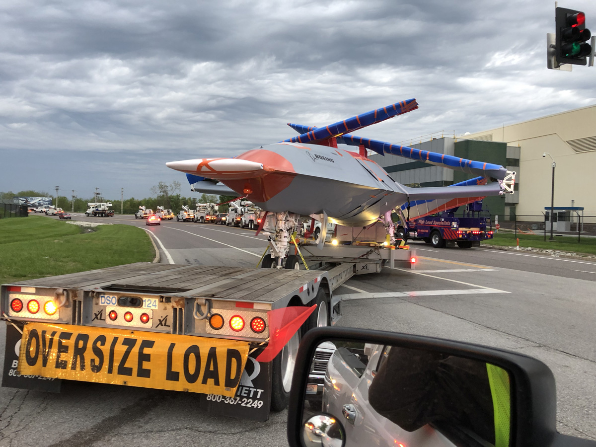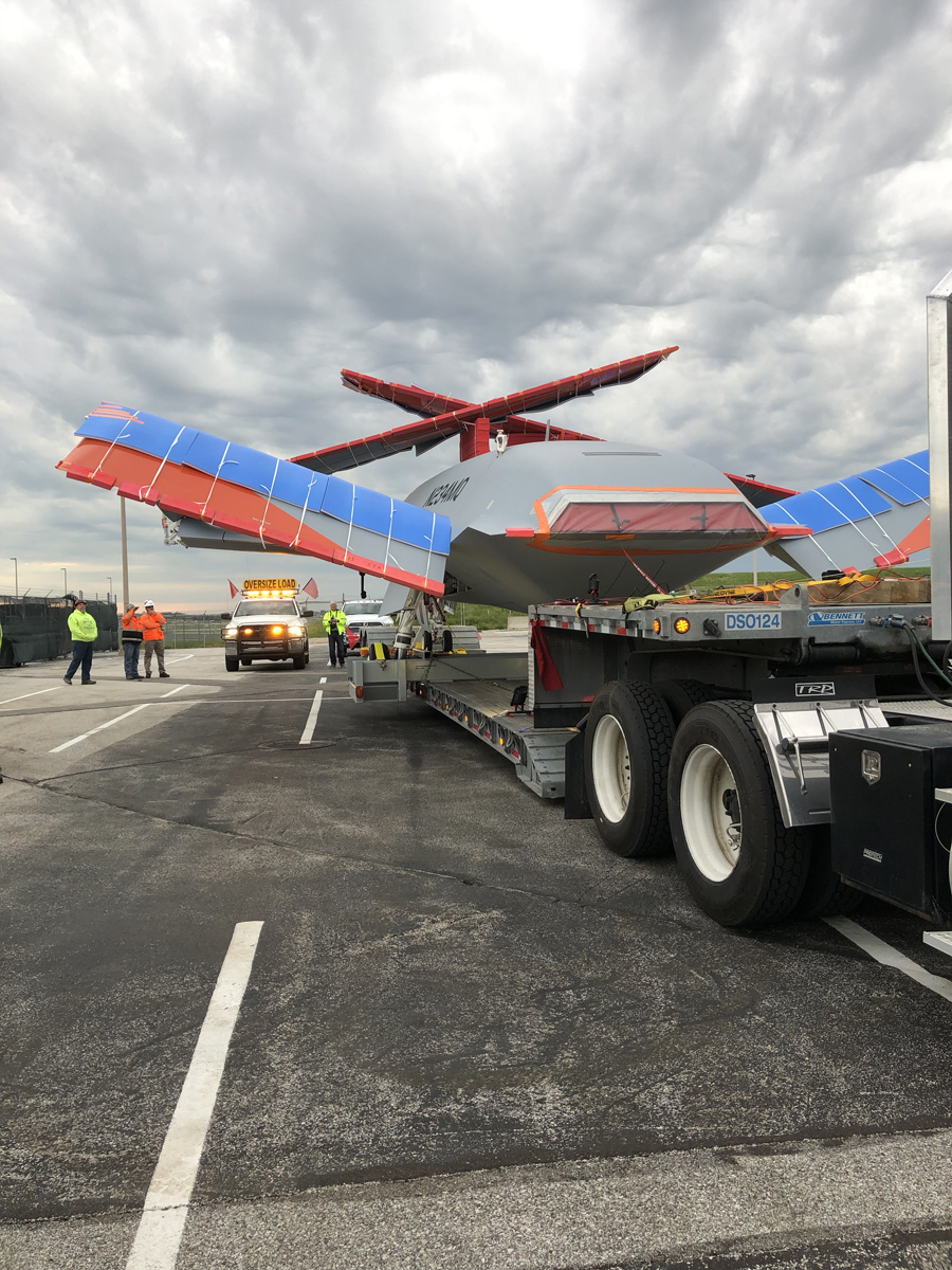 After the weeks of planning and a nerve-wracking 10 hours crawling through Missouri and Illinois, there was intense relief as well as a sense of pride as the MQ-25 arrived at the airport. “We pulled into the gate, and everybody was happy and high-fiving everyone. That’s when we knew we did a great job. It was all a team effort,” Wengerd recalls.